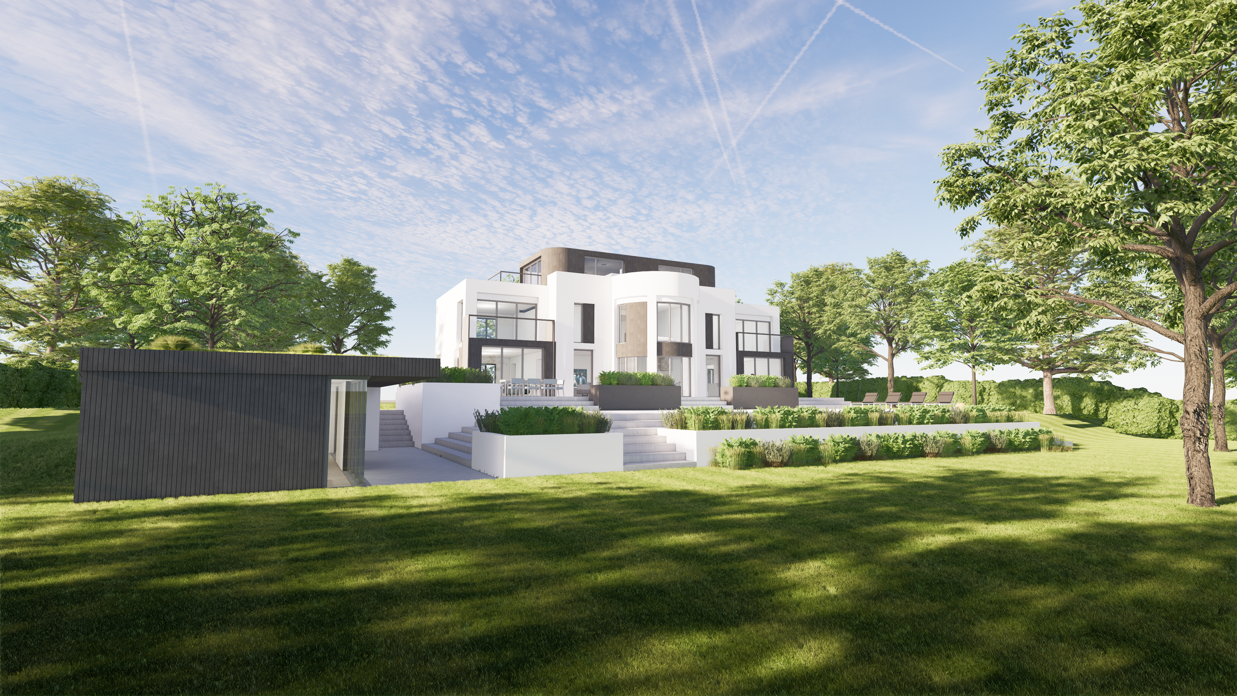 A remodelling of a 1970 art deco style home in Stansted Mountfitchet, Essex. Ensuring that the remodelling enhanced the character of the original house influenced features like the rounded corners whilst externally insulating the building improved the buildings energy efficiency. This also allowed the crisp white render to be applied, refreshing the buildings appearance. Its nickname in the office is Miami.
